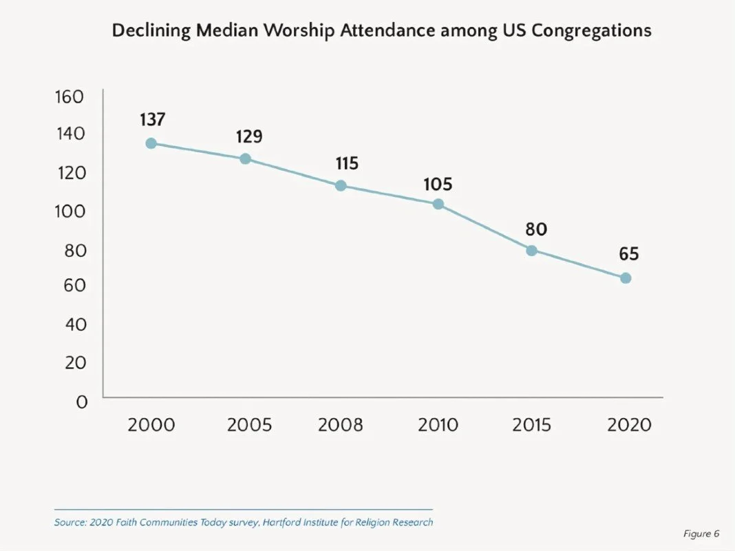 It also found that half of the country’s estimated 350,000 religious congregations had 65 or fewer people in attendance on any given weekend. In 2000, when FACT first began surveying data, the median attendance level was 137. That’s a drop of more than half in just two decades.