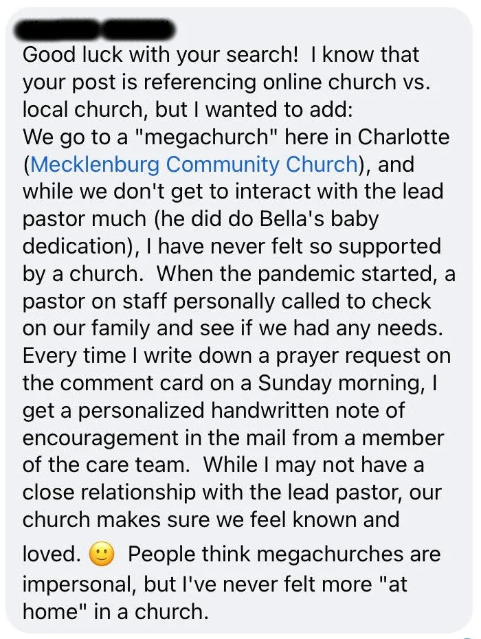 For any size church, it’s all about intentionality. I was reminded of this anew when a member of our social media team sent out the following to some of our staff. It was a comment on a Facebook post about looking for churches: