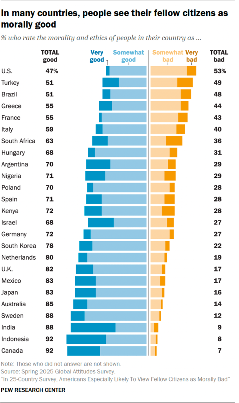 Jonathan Evans et al., “In 25-Country Survey, Americans Especially Likely to View Fellow Citizens as Morally Bad,” Pew Research Center, March 5, 2026, read online.