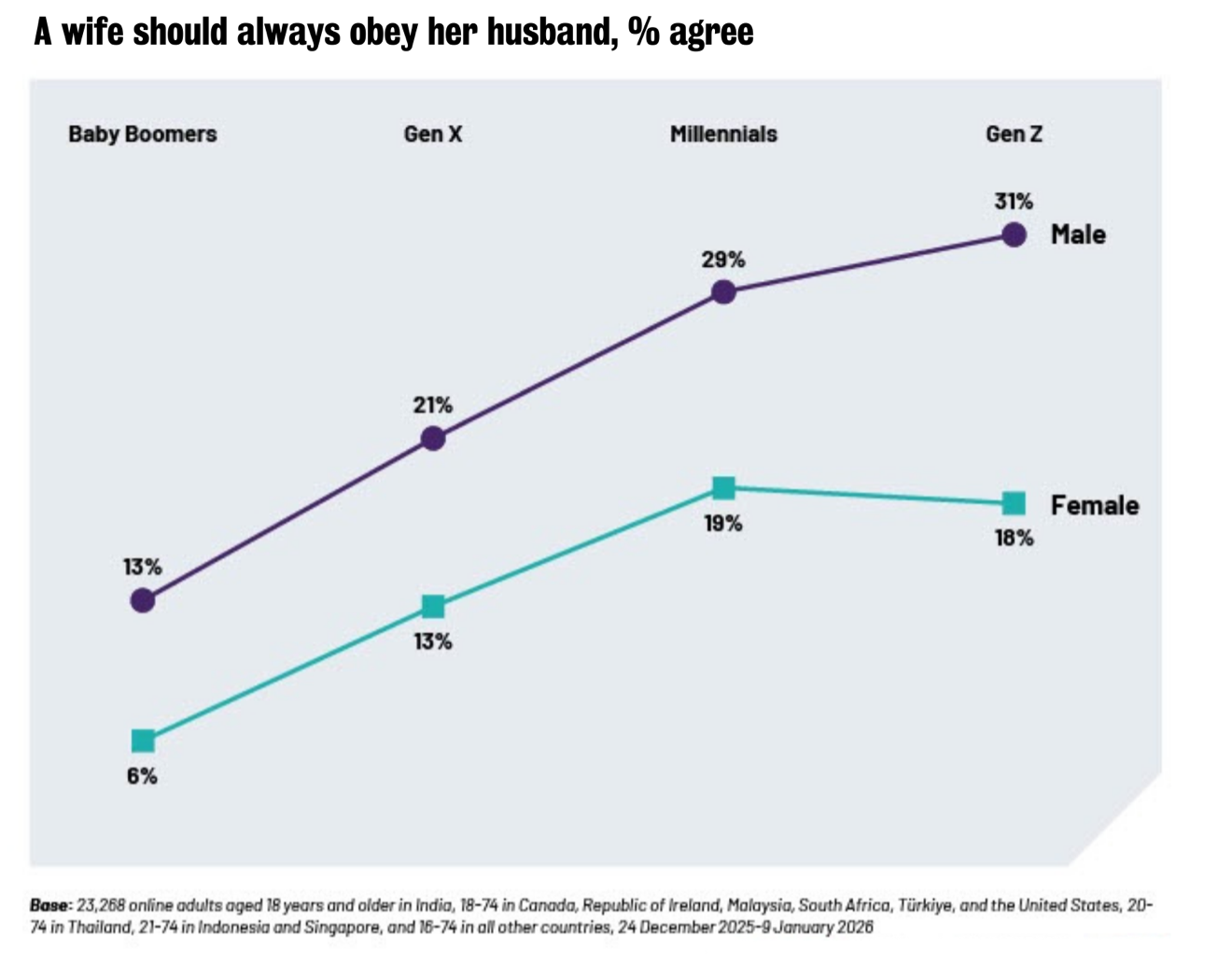 According to a 29-country survey, which included Great Britain, the United States, Brazil, Australia and India, almost a third of Gen Z men agree a wife should obey her husband. Specifically, 31% of Gen Z men agree that a wife should always obey her husband, and one third (35%) say a husband should have the final word on important decisions.